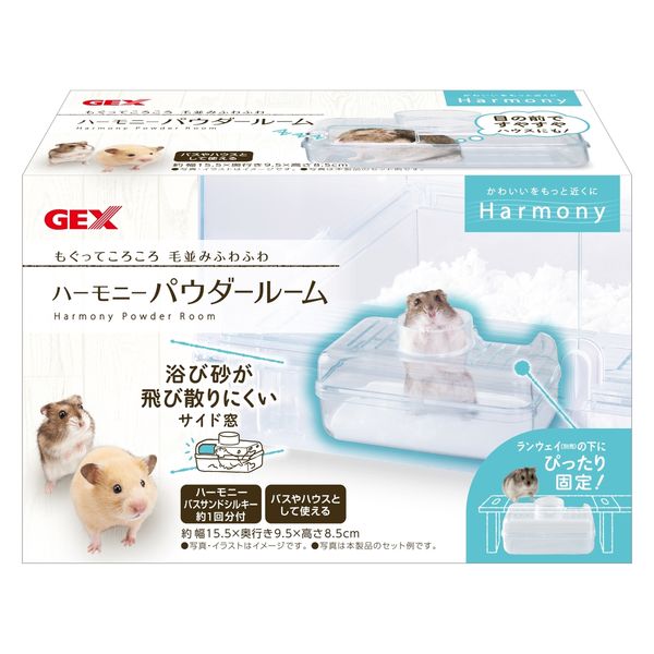 | 商品の特徴 | バスやハウスとして使えるパウダールーム。粉雪のように真っ白さらさらな浴びずな「ハーモニーバスサンドシルキー」(別売)が約1回分付き。浴び砂が飛び散りにくいサイド窓採用。思う存分もぐってころころを楽しめます。クリアな本体なので、目の前ですやすやする姿も良く見える!バスやハウスにも!ゴールデンでも出入りらくらくサイド窓。ハーモニーランウェイ450・600(別売)の下にピッタリ固定。一緒に使えば、かわいいしぐさがもっと近づく!#小動物 ハムスター バス 浴び砂 ランウェイ | ||