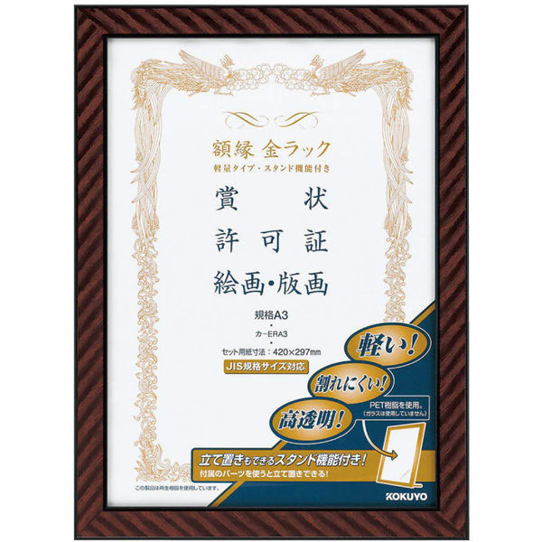 | 商品の特徴 | 表装材には、ガラスと同等の透明度を持ちながら、軽量で割れにくいPET樹脂を使用しています。●付属の木製棒を使用すれば、壁掛けだけでなく立て置きすることもできます。●フレームに再生材を使用した、グリーン購入法適合商品です。●個装箱(紙製)入り。●タテ向き・ヨコ向きのどちらでも使用可能。●種類/規格A3 | ||