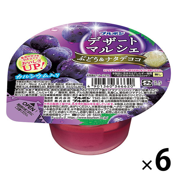 | 商品の特徴 | ぶどう果肉とナタデココが入った、デザートにちょうどいいサイズのカップゼリーです。食物繊維を配合しています。 | ||