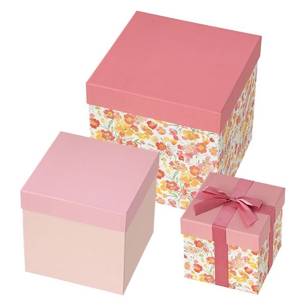 | 商品の特徴 | 【在庫一掃】一番小さいボックスにはピンクのサテンリボンがついています。飾るだけで売り場が華やかになります。ディスプレイとしてお使いいただけます。ギフトボックスとしてお使いいただくのもおすすめです。1セット3サイズの組み立て済の箱を入れ子にした状態でお届けします。 | ||