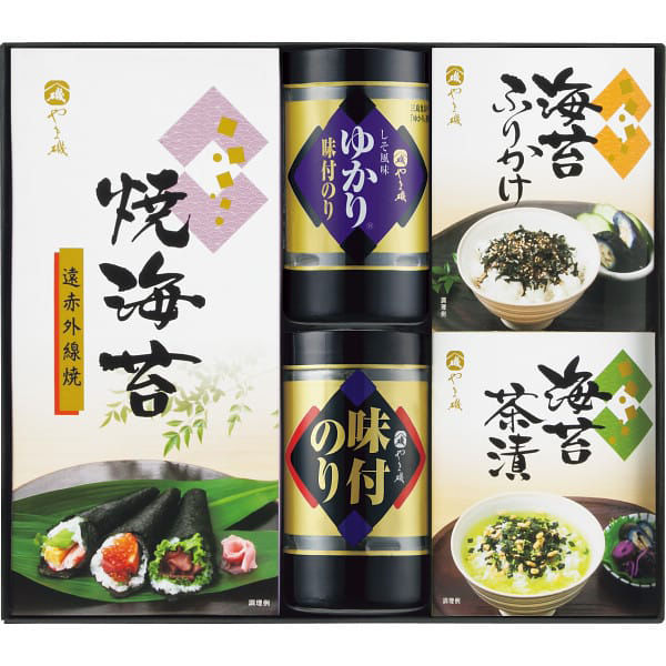 | 商品の特徴 | 口どけのよい海苔に有機丸大豆醤油使用のたれで調味した味付海苔、三島食品の「ゆかり」を使用したたれで調味した赤しそ風味の味付海苔、遠赤外線でパリッと焼き上げた風味豊かな焼海苔、味付海苔と香ばしいごまの風味がおいしい海苔ふりかけ、焼海苔にごまやあられをブレンドした後味さわやかなお茶漬けをセットしたバラエティギフトです。 | ||