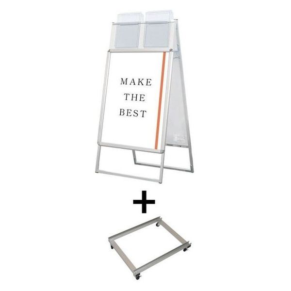 【ポスタースタンド】A4サイズのカタログを配布できるケースが付いた四辺開閉式のスタンド看板+アームキャスターセット