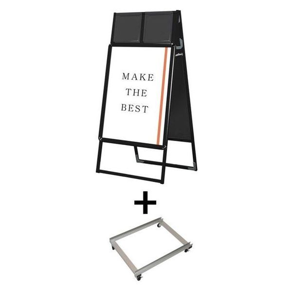 【ポスタースタンド】A4サイズのカタログを配布できるケースが付いた四辺開閉式のスタンド看板+アームキャスターセット