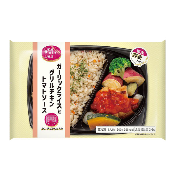 - ガーリックライス(米(国産)、押麦、人参、玉葱、にんにく、チキンブイヨン、食塩、香味食用油、ガーリックペッパーシーズニング、胡椒、パセリ)、グリルチキントマトソース(鶏肉、さつまいも、玉葱、トマト加工品、ブロッコリー、南瓜、揚げ茄子、トマトケチャップ、馬鈴薯澱粉、米酢、植物油脂、醤油、チキンブイヨン、還元水飴、味醂、清酒、砂糖、おろし生姜、ウスターソース、おろしにんにく、胡椒)/調味料(アミノ酸等)、増粘剤(加工澱粉、増粘多糖類)、着色料(カラメル、カロチノイド)、酸味料、香辛料抽出物、pH調整剤、微粒二酸化ケイ素、香料、乳化剤、(一部に小麦・乳成分・ごま・鶏肉・豚肉・牛肉・大豆を含む)