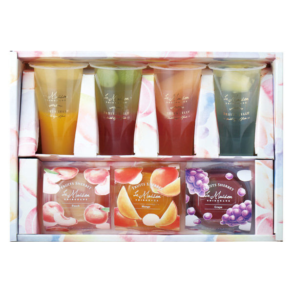 | 商品の特徴 | フルーツの味わいを楽しめる果肉入り2層ゼリー4種と、果肉入りシャーベット3種の詰め合わせ | ||