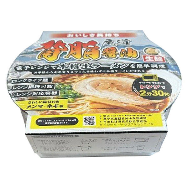 | 調理法 | 1,麺と沸騰したお湯350mlをカップに入れる2,電子レンジで加熱(600ワットで2分30秒)3,スープと具材を入れ、よくかき混ぜる4,お湯にスープが溶ければ完成 | 特徴 | 独自配合、製法で生麺のラーメンが電子レンジで時短かつ簡単に作れる |