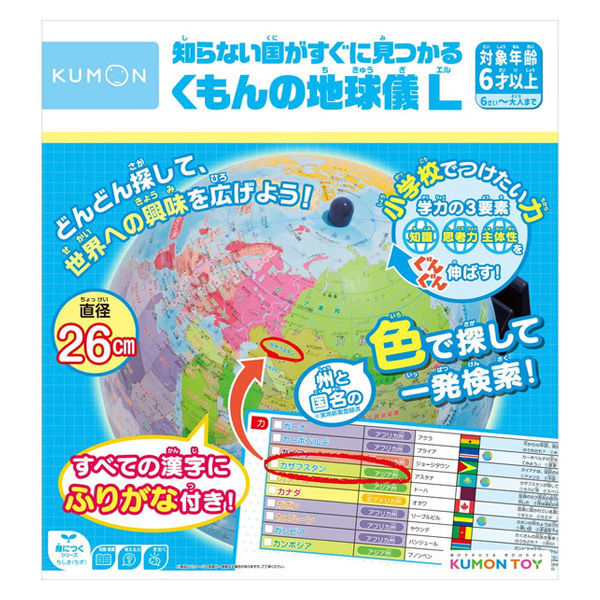 大好評の『くもんの地球儀L(26cm)』が新パッケージで新発売!どんどん探して世界への興味を広げよう。幼稚園・保育園・学童の知育玩具におすすめです。