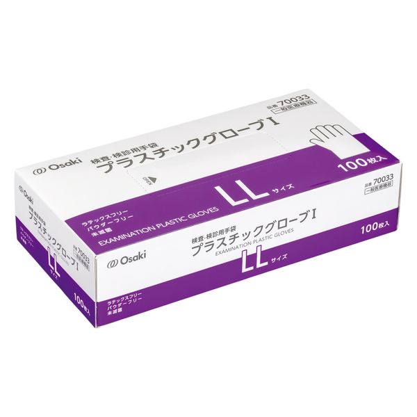 オオサキメディカル プラスチックグローブ I 透明 LL 70033 一般医療機器 粉なし 使い捨て 1箱(100枚入)