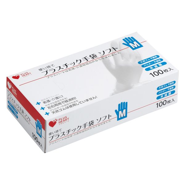 オオサキメディカル プラスハート プラスチック手袋ソフト M 透明 70008 粉なし 使い捨てグローブ 1箱(100枚入)