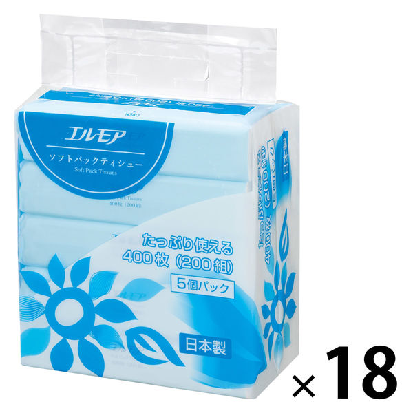 ティッシュペーパー 200組 1セット(5個入×18)エルモア ソフトパックティシュー カミ商事