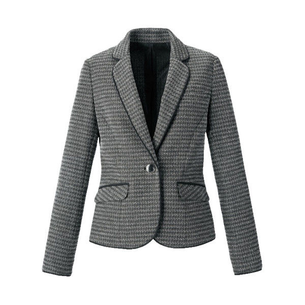 | 商品の特徴 | ツイード風柄のニット素材。黒ベースに杢グレーのブークレー糸使いにより、優しい印象に。襟~裾にサテンパイピング入り。伸縮性もあり動きやすく快適な着心地です。袖口折返し可能。 | ||