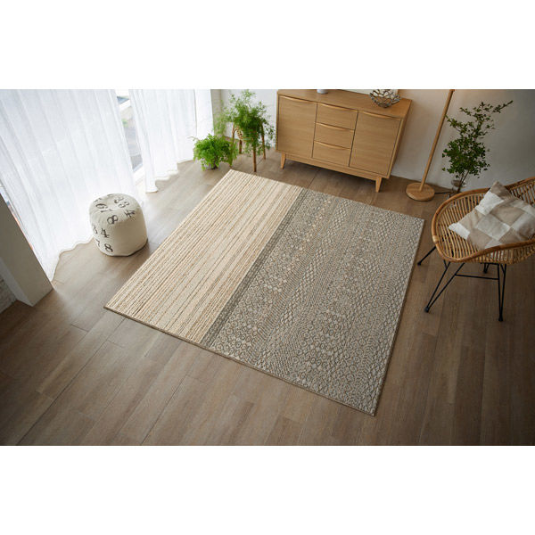 ウールを含め5 種類の糸を挿入し、複雑な糸通しと組織で質感のあるストライプを表現した、優しい色味のカーペットです。