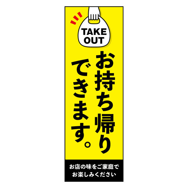 「お持ち帰り」幟です。どんなジャンルの飲食店にも合うよう、シンプルで目立つデザインにしました。(Y.M)