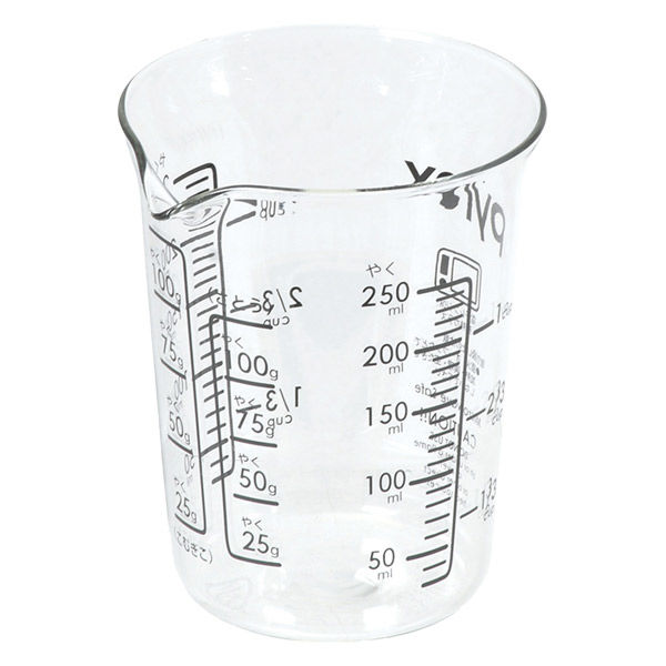| 商品の特徴 | 250mlの計量カップです。 軽くて持ちやすい形状です。 強化ガラス製なので熱いお湯も計れます。 そのままレンジで温めることができます。 目盛付きで下ごしらえにも便利です。 食洗機対応なのでお手入れが簡単です。 注ぎ口が付いているので、液体を注ぐ時もこぼれにくいです。 ※オーブンや冷凍庫はご使用いただけません。 | ||