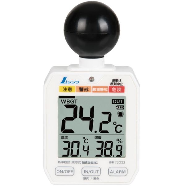 - ●WBGT値(暑さ指数)の計測が可能です。●屋内と屋外の測定切り替えができる、屋内モード/屋外モード切替機能付です。●熱中症の注意レベルを環境に合わせて自動で切り替え、表示と警告ランプ、アラームでお知らせします。●警告ランプとアラーム機能を搭載し、危険をすぐに知らせます。●精度:WBGT/±-2℃(JISB7922:2023クラス2準拠)、温度/20~50℃±0.6℃、それ以外±1℃、湿度/30~90%:±5%(20~30℃の環境で)、それ以外±10%●アラーム音量(10cm離れた場所での音量です。):消音、小/60dB、<大/70dB●三脚取付ネジ1/4インチ(底面)●バンド●ホルダー・バンド用アタッチメント●M3ネジ●取扱説明書