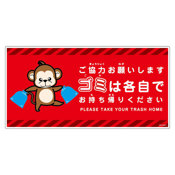 | 商品の特徴 | ●ゴミは各自持ち帰り標識は、各自で出したゴミを持ち帰っていただくように、注意をうながす標識です。●ゴミ箱を設置していない場所や施設、ゴミを捨ててはいけない所での注意喚起に最適です。●視認性が高く、目にとまりやすいデザインやカラーです。●設置する場所などに応じて、サイズや材質をお選び頂けます。 | ||