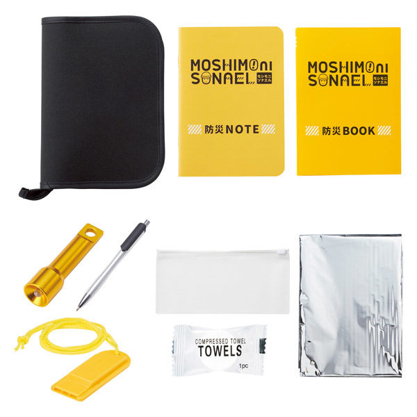 - ポーチ:ポリエステル、 アルミシート:アルミニウム、PET、 ホイッスル:ポリスチレン、ポリエステル、 ライト:アルミニウム、 ジッパーポーチ:PVC、 圧縮タオル:綿、 ボールペン:ABS、 防災ノート・防災ブック:紙