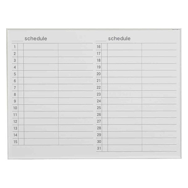 | 商品の特徴 | 壁面になじむ白色アルミ枠の耐久性抜群のホーロー製ホワイトボード。横罫の月間スケジュール記入用のレイアウトです。下部粉受け付き。フレーム下部に粉受け付き。書き込みはホワイトボード用マーカーをご使用ください。マグネットで印刷物などの掲示も可能です。スケジュールの共有や工程管理などに便利です。 | ||