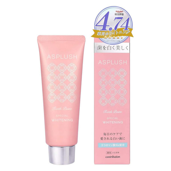 | 商品の特徴 | ★ピーチミント味★やさしい甘さがほしい方●クリニックでのホワイトニングは歯を真っ白にしてくれますが歯磨き粉でホワイトニングができるASPLUSHは歯をナチュラルな白さに導いてくれます。また、歯磨き粉によるホワイトニングは刺激が少ないので痛みに繋がりにくくなっています。●歯を白く、美しく落ちにくい油性の汚れも絡めて落とす有効成分「PEGー8」配合。歯磨きの効果と合わせ歯垢がたまるのを防ぎ、むし歯の予防、口臭の予防にも期待できます。 | ||