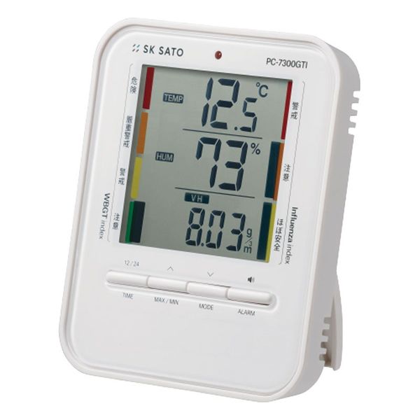 - ●【測定範囲】温度-9.9~50.0℃/湿度20~95%rh●【測定精度】温度±1.0℃(10~40℃)±2.0℃(左記以外)/湿度:±5%rh(40-80%rh、at20~30℃)±8%rh(上記以外)●分解能:温度0.1℃湿度1%rh暑さ指数1℃絶対湿度0.01g/m3●測定サンプリング:約30秒●センサ:温度、サーミスタ、湿度、高分子抵抗変化型湿度センサ●警報設定範囲:暑さ指数0~50℃の範囲において1℃刻みで設定可能●仕様環境条件:-10~50℃、95%rh以下(結露なきこと)●保管環境条件:0~50℃、85%rh以下(結露なきこと)●サイズ:W100×D18×H120mm●材質:ABS樹脂・アクリル樹脂●重量:約151g●電源:単4電池×2(動作確認用)●屋内専用●4段階表示(夏)●3段階表示(冬)