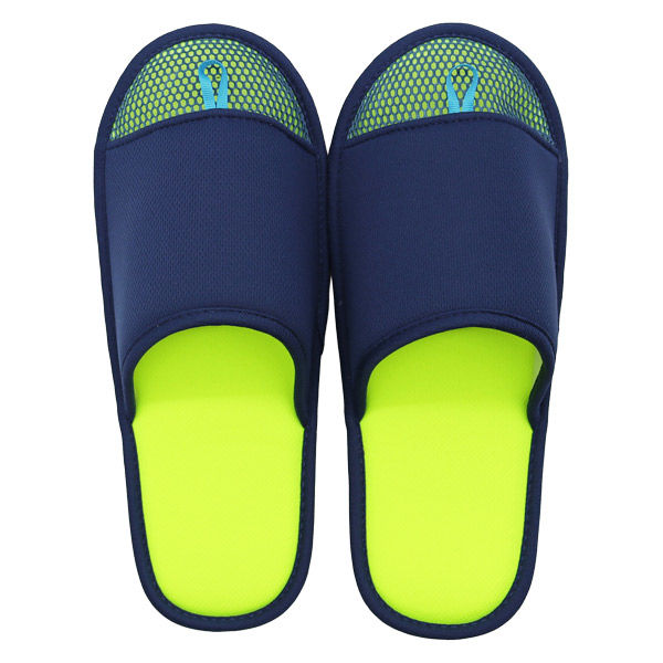 | 商品の特徴 | つま先部分は大き目ピッチのメッシュ素材で通気性抜群!中敷きには鹿の子ニットを使用し涼しげで乾き易い仕上がり。かさばらないスリムな形状の洗濯機で洗えるスリッパです。 | ||