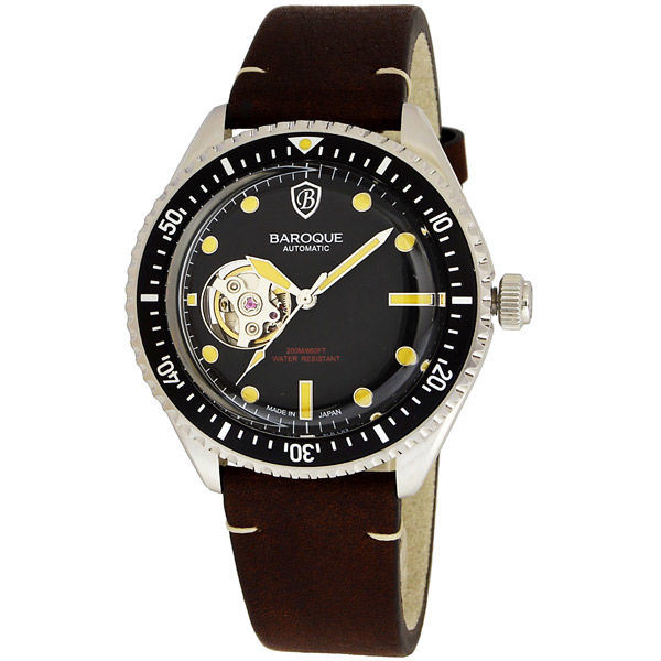 機能 逆回転防止ベゼル、ねじ込み式リューズ、200M防水 バンド 牛本革オイルレザーベルト