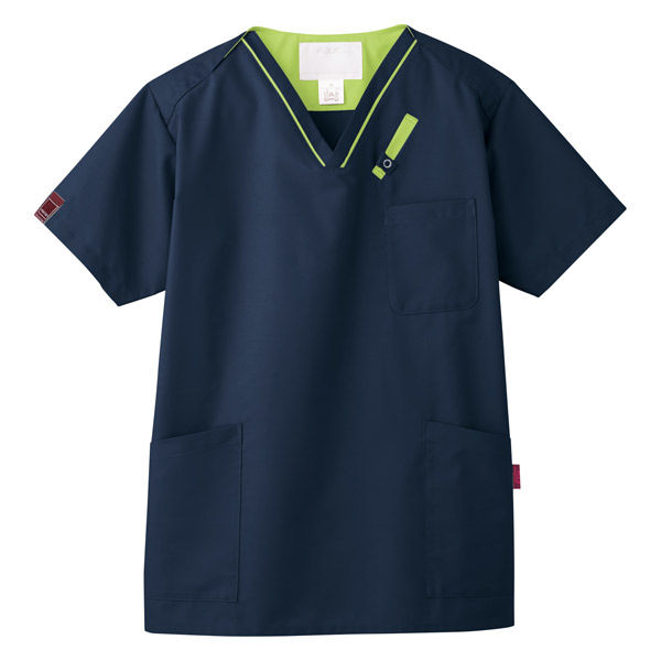 | 商品の特徴 | ミッドナイトネイビー×ライムのさりげない配色がアクセントのユニセックススクラブ。着用すると隠れる首元の配色見返しが、おしゃれなポイントです。人気のPANTONEスクラブに重量拡散のPHSポケットを追加し、Vネック部分の配色切り替えをデザインアクセントにしました。素材には、ポリエステル65%・綿35%の「スクラブポプリン」を使用。ダンガリーシャツのような肌触りで、使い込むほどに風合いが増す素材感が特徴です。男女兼用のため、スタッフ全員でユニフォームを揃えやすい一着です。 | ||