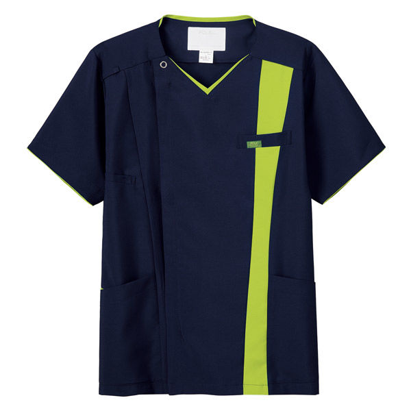 頭からかぶって着る従来のスクラブと違い、羽織って着ることができるので髪形が崩れず人気!フォークのジップスクラブ(R)。左胸から背中にかけてのストライプがポイント。
