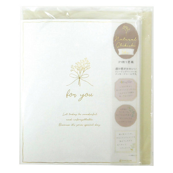 | 商品の特徴 | ナチュラルな表紙に箔でポイントのイラストが描かれた三つ折りの色紙です。枠が箔押しされているトレペシールが華やかで優しい雰囲気に仕上がります。大人数で使い易いメッセージシール(54人分)・封筒付き。 | ||