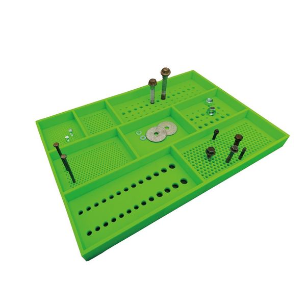 - ●ボルトやネジ類の整理に特化しており、位置と方向を明確に保持できるため、再組立がスムーズに行えます。●化学薬品に耐性があり、高耐久性と高耐熱性を備えています。●5種類の穴サイズを備え、幅広いファスナーに対応します。●小物をまとめて置ける便利なキャッチオールエリアを中央に配置しています。●側壁の高さは41mmあり、部品の落下を効果的に防ぎます。●底部・側壁・パターン部をすべて強化しており、過酷な現場でも対応可能です。●自動車整備、機械修理、木工、航空機整備など、さまざまな作業現場でボルトやネジ類、その他の小物整理に。