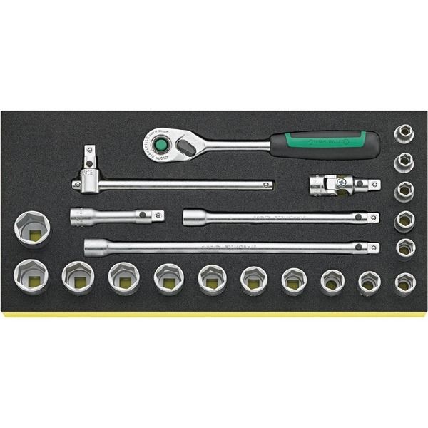 | 商品仕様1 | ●膝をついた姿勢での作業をより快適に保ち、不自然な姿勢での作業から身を守る。●ワークショップ、タイヤ交換、ガーデニング、床材敷設に最適。ハイキングやスタジアムでの携帯用シートパッドとしても使用可能。●高品質で断熱性のあるフォーム素材(防汚、防水加工)。●セット内容:●3/8"SQ80ギアラチェットハンドル:435QRN3/8"SQユニバーサルジョイント:428QRエキステンションバー:427QR/3・427QR/6・427QR/103/8"SQスライドTバー:425QR3/8"SQ6角ソケット:7・8・9・10・11・12・13・14・15・16・17・18・19・20・21・22mm(456-7・8・9・10・11・12・13・14・15・16・17・18・19・20・21・22) | トレイサイズ(W×D×Hmm) | 175×350×40 |