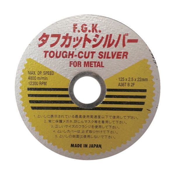 | 商品の特徴 | ●タフカットシルバーはステンレス等の難研削材をも容易に切断可能です。●薄板等の切断において画期的な威力を発揮します。●砥石をより補強する目的で特殊加工したグラスファイバーを両面に接着加工しています。●通常品と比べて5倍程度の耐摩耗性を有するため、経費の削減に極めて有効です。●1枚あたりの使用ライフが長いことから砥石の交換頻度も自ずと少なくてすみ、生産性の向上に貢献します。 | ||