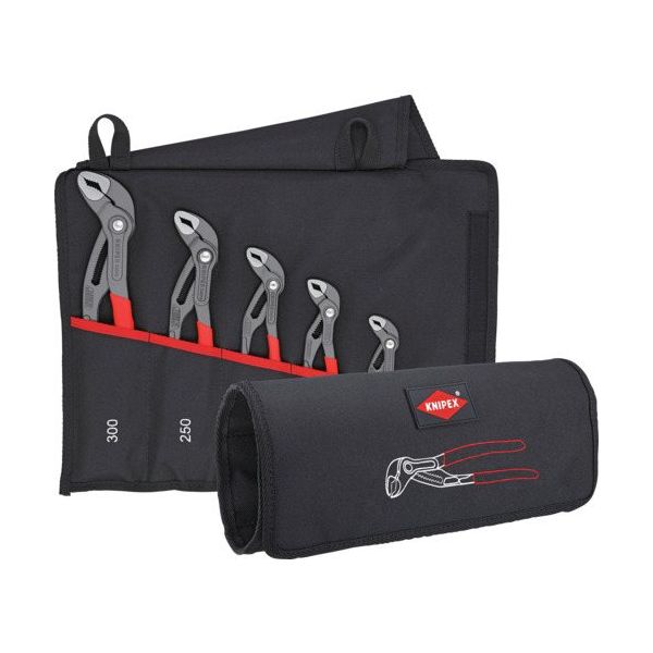 - ●アゴの開口幅の調整はプッシュボタンにて行うため、すばやく操作ができます。●上アゴを対象物にあて、プッシュボタンを押しながら下アゴを上アゴに向かってスライドさせるだけなので、片手で簡単に行えます。●調整段階が多いので細かい開口幅の調整も行えます。●アゴの開閉はプッシュボタンで行うため、作業中に不意に口幅が変わらないので安心して作業ができます。●アゴの形状はパイプやナットを少ない力で確実につかめる平行四角形です。●入念な焼入れ処理が施された掴み面は硬度約61HRCで、耐磨耗性が高く確実なグリップを発揮します。●ジョイント部は横方向へのブレを防止する3枚合わせ(ボックスジョイント)です。●握ったときに、てこの原理を最大限発揮するデザインで、高いグリップ力を発揮します。●最大開口幅にして握っても、ハンドルの間にクリアランスを確保する指詰め防止用のストッパー付きです。●ツールロールは耐久性のあるポリエステル生地で、持ち運びや工具の保管に最適です。●ウォーターポンププライヤー・コブラ5点+ツールロールのセット●セット内容:●8701125(全長125mm、最大口開き27mm、調整13段階)●8701150(全長150mm、最大口開き30mm、調整11段階)●8701180(全長180mm、最大口開き36mm、調整18段階)●8701250(全長250mm、最大口開き46mm、調整25段階)●8701300(全長300mm、最大口開き60mm、調整30段階)●ツールロール(001955S5LE)幅430×高さ325mm※展開時
