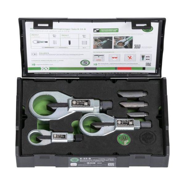 | 商品の特徴 | ●幅広い範囲のサイズに対応可能なセット品です。●800 N/mm2までの引張強度のナットを押し割ることで取り外せます。●ボルトのネジ山を損傷することなくナットを取り外し出来ます。●ケース内には型取りフォームが入っておりツールの紛失予防になります。●セット内容:●ナットブレーカー(55-1、55-2、55-3)×各1、替え刃(55-1-M、55-2-M、55-3-M)×各1、ネジやすり×1 | ||