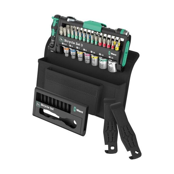 - ●自転車のメンテナンス、組立に最適なツールセットです。●極めてコンパクトなケースにワークショップやツアーで活躍するバイクツール41点を収納しております。●Kraftform ビットホルダー、Zyklop Mini ビットラチェット、ラピダプターホルダーが収納されており、多種多様な状況下でのネジ回しが可能です。●緑のロック部がツールを固定し快適な運搬とツールの紛失防止を実現します。●ピーク荷重時の運動エネルギーを分散し、ビット先端がねじれるのを防ぐBiTorsionビットが収納されています。●Take it easy 色分けシステムによって瞬時にビットの形状とサイズを識別することができます。●ガラス繊維強化プラスチック製のタイヤレバーが付属しており、リムを傷つけることなく安全にタイヤを外すことができます。●9502タイヤレバーはビット装着が可能で、仏式バルブ(フレンチバルブ)の固定に対応しています。●9503タイヤレバーにはバルブイジェクター(バルブ抜き)機能が付いています。●自転車乗車時の負担を軽減するためにビットチェック用の空ケースに必要最低限の工具をセットして快適に持ち運べます。
