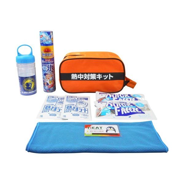 | 商品の特徴 | ●定番の熱中対策セット、ポーチに入った熱中対策●今までになかった熱中対策キット。●軽量・コンパクトで常備・持ち運びが便利。●収納バッグは目立つオレンジ色。●名刺大のカードが入る透明ポケット付き。●熱中予防はもちろんのこと、緊急時にも役立つグッズを揃えました。●熱中対策用にアウトドアや学校行事での応急常備用としてご活用ください。●セット内容:●ポーチ×1、タオルに氷をつくるスプレー230ml×1、カラビナボトル入クールタオル×1、熱中症予防カード×1、熱さまシート×2、瞬間冷却パック×2 | ||