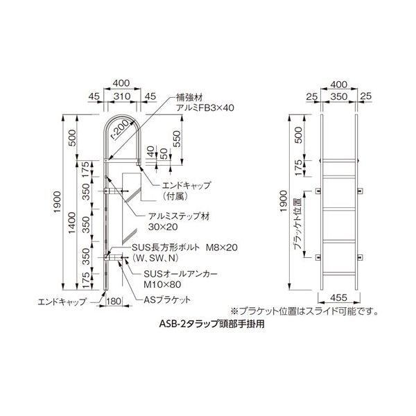 | 備考 | 【返品について】お客様のご都合による返品はお受けできません。●ブラケット取付面は付属のゴムパッキンを使用し、漏水防止の為コーキング等の充填の処置をお願い致します。●本製品に当社(メーカー)規定以外の物は取付けしないでください。(アンテナ、煙突他)電気コード等を巻き付けないでください。漏電、感電の恐れがあります。●ASB-1、ASB-2は、アルマイト材を曲げ加工しています。●頭部手掛け(ASB-1、ASB-2)には、ブラケットを2組取付けてください。●最上部ブラケットの取付け位置は頭部の最上部から1200mm以内で取付けてください。●最下部ブラケットは、本体最下部から450mm以内に取付けてください。●タラップブラケット取付ピッチは1200mm以内で設置してください。●画像は代表画像です。 | ||