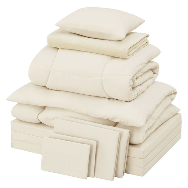 | 材質 | 掛け布団:側生地/ポリエステル100%・詰めもの/ポリエステル100%、ボックスシーツ:側生地/ポリエステル100%、枕:側生地/ポリエステル100%・詰めもの/ポリエステル100%、収納バッグ:不織布、毛布:側生地/ポリエステル100%、掛け布団カバー:側生地/ポリエステル100%、ボックスシーツ:側生地/ポリエステル100%、枕カバー:側生地/ポリエステル100%、三つ折りマットレス:側生地/ポリエステル100%、詰めもの:ウレタンフォーム | 質量 | 掛け布団:1500g(詰め物:約1.0kg)、敷き布団:約2100g(詰め物:約1.0kg)、枕:約400g(詰め物:約0.35kg)、毛布:約550g、掛け布団カバー:約550g、ボックスシーツ:約300g、枕カバー:約50g、三つ折りマットレス:約2760g、収納バッグ:約250g |