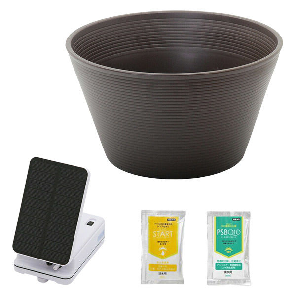 - 睡蓮鉢 ブラウン×1、ソーラー充電式エアポンプ(エアストーン、エアチューブ付属)×1、Q10スタート 淡水用 30mL×1、PSBQ10 ピーエスビーキュート 淡水用 30mL×1