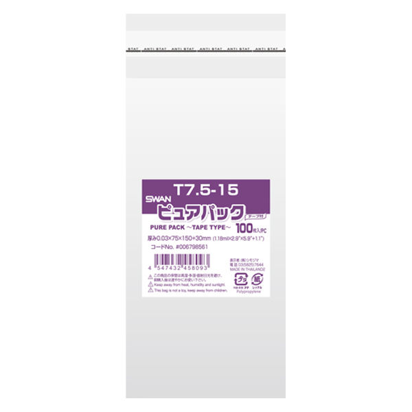 SWAN ピュアパック OPP袋 T7.5-15 幅75×高150mm 透明封筒 1袋(100枚入)006798561 シモジマ