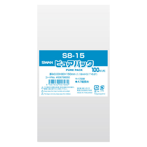 SWAN ピュアパック OPP袋 S8-15 幅80×高150mm 透明封筒 1袋(100枚入)006798550 シモジマ