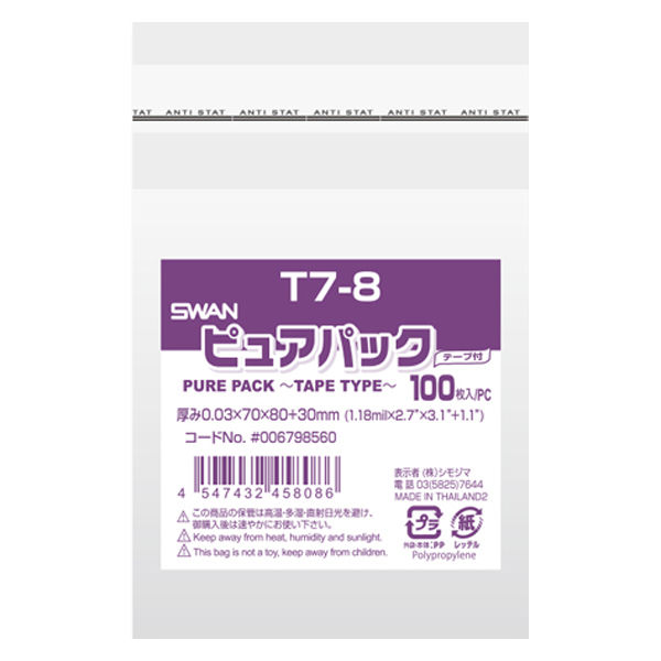 SWAN ピュアパック OPP袋 T7-8 幅70×高80mm 透明封筒 1セット(1袋(100枚入)×10)006798560 シモジマ