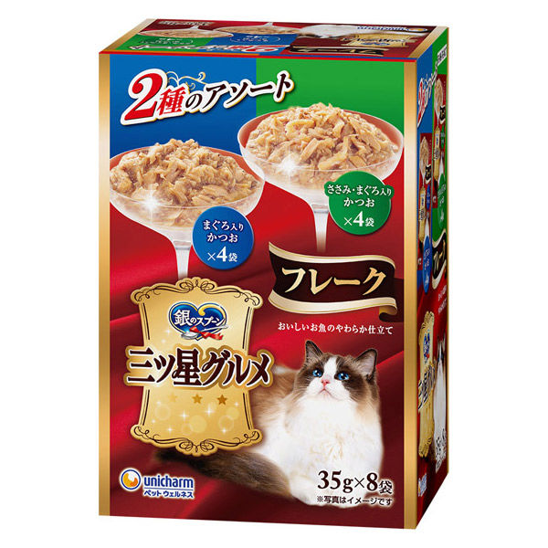 銀のスプーン 三ツ星グルメ パウチフレーク 2種のアソート まぐろ入りかつお&ささみ・かつお(35g×8袋)1個 キャットフード ウェット