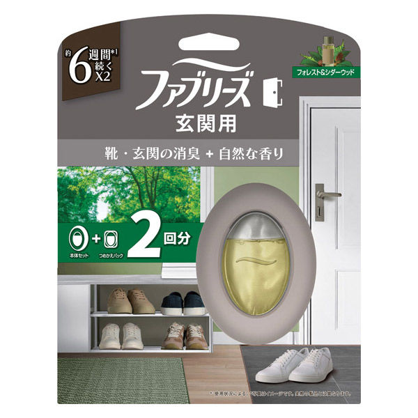 | 商品の特徴 | 靴・玄関の消臭+自然な香りフォレスト&シダーウッドの香り。消臭効果は約6週間持続します(使用状況による)。写真はイメージです。実際の製品とは異なります。*1使用状況による。 玄関用消臭剤 | ||