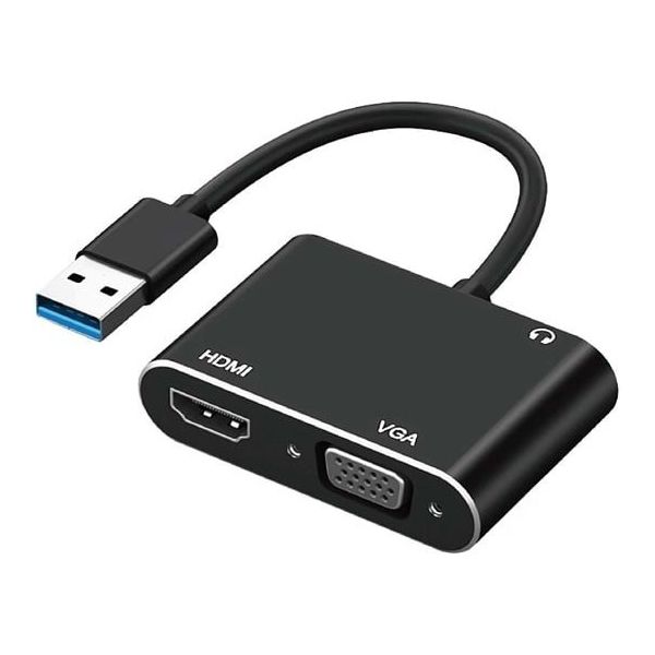| 商品の特徴 | ●USBポートからHDMI/VGAに変換し映像出力できるUSB-HDMI/VGAディスプレイアダプタ。●WindowsとMacに両対応。●HDMIとVGAの2画面同時出力に対応。●拡張モード、複製モードの2種類の表示モードから選べます。●本体に内蔵のドライバーをインストールするだけで簡単に使用できます。●持ち運びに便利なUSBケーブル一体型の軽量コンパクト設計。 | ||