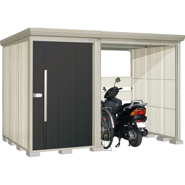 | 商品の特徴 | 丈夫で安心の柱構造・頑丈設計の駐輪スペース付き物置です。扉は連動吊り戸方式だから開閉が「軽い」「静か」「スムーズ」です。物置と駐輪スペースは左右を選んで設置できます。 | ||