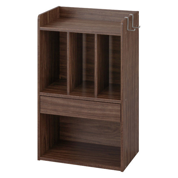 | 寸法 | 本体:約幅452×奥行287×高さ763mm、天板サイズ(約):約幅428×奥行270mm、本棚内寸(約):約幅134×奥行272×高さ324mm、引き出し内寸(約):約幅391×奥行235×高さ66mm、オープンスペース内寸(約):約幅428×奥行272×高さ231mm | カラー | ウォールナット |