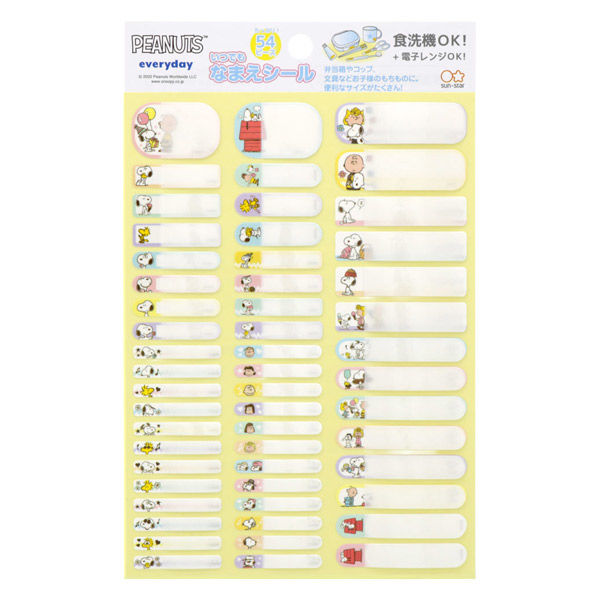 | 商品の特徴 | 弁当箱やコップ、文具などお子様のもちものに。便利なサイズが”54ピース”! 水や汚れに強い名前シールです。柄は「スヌーピー」の仲間たちで癒やされて。 | ||