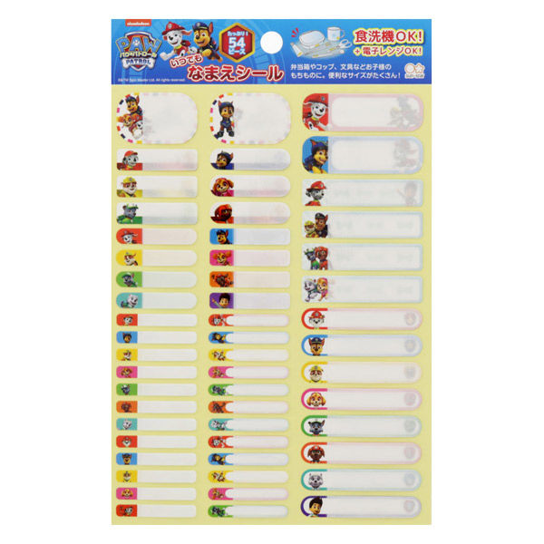 | 商品の特徴 | 弁当箱やコップ、文具などお子様のもちものに。便利なサイズが”54ピース”! 水や汚れに強い名前シールです。柄はキュートな「パウ・パトロール」。 | ||