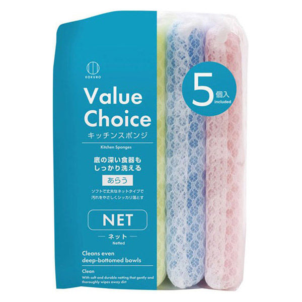 キッチンスポンジ バリューチョイス ネットスポンジ 泡立ちがよい グラス・食器洗い 3色アソート 1パック(5個入)小久保工業所